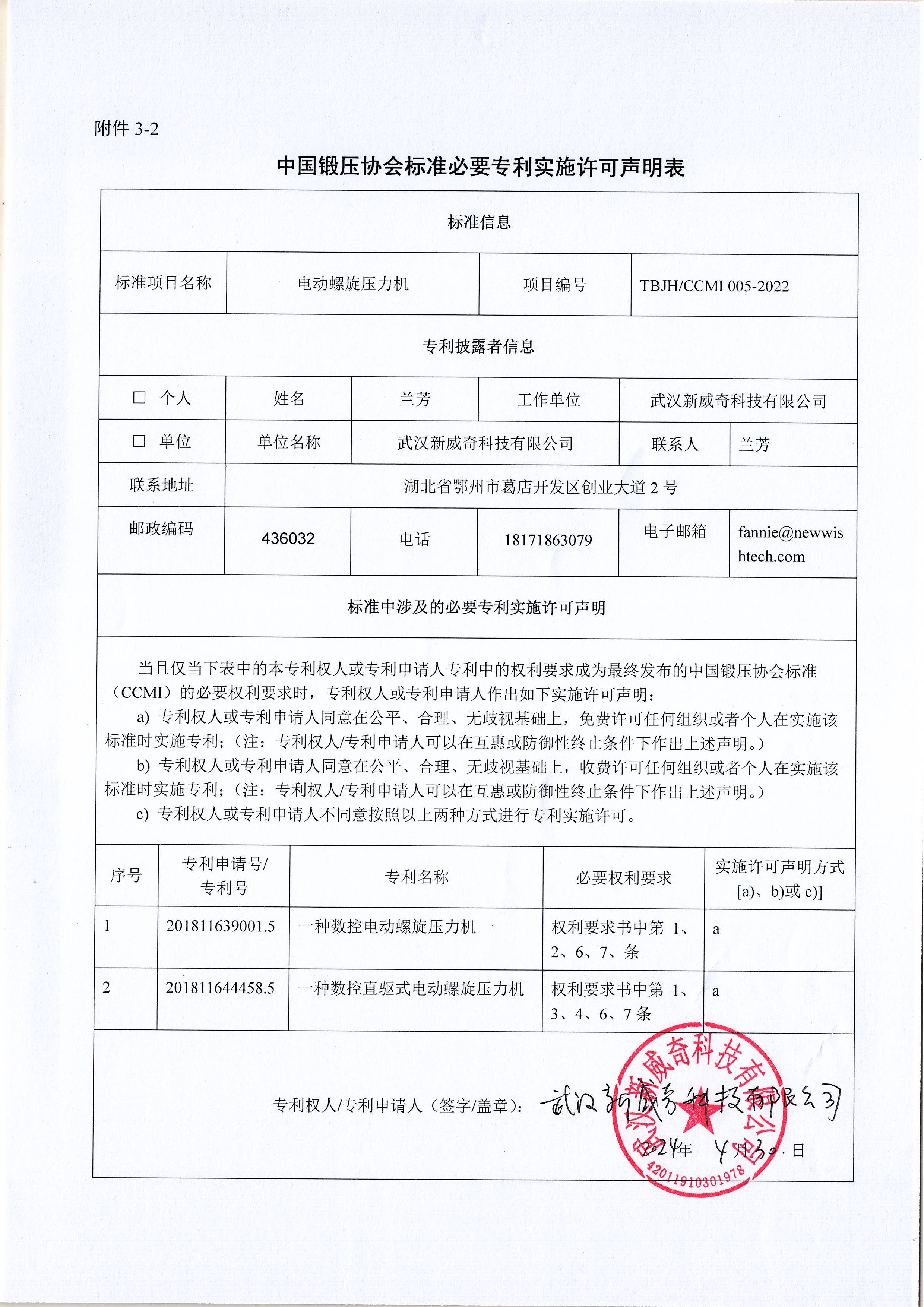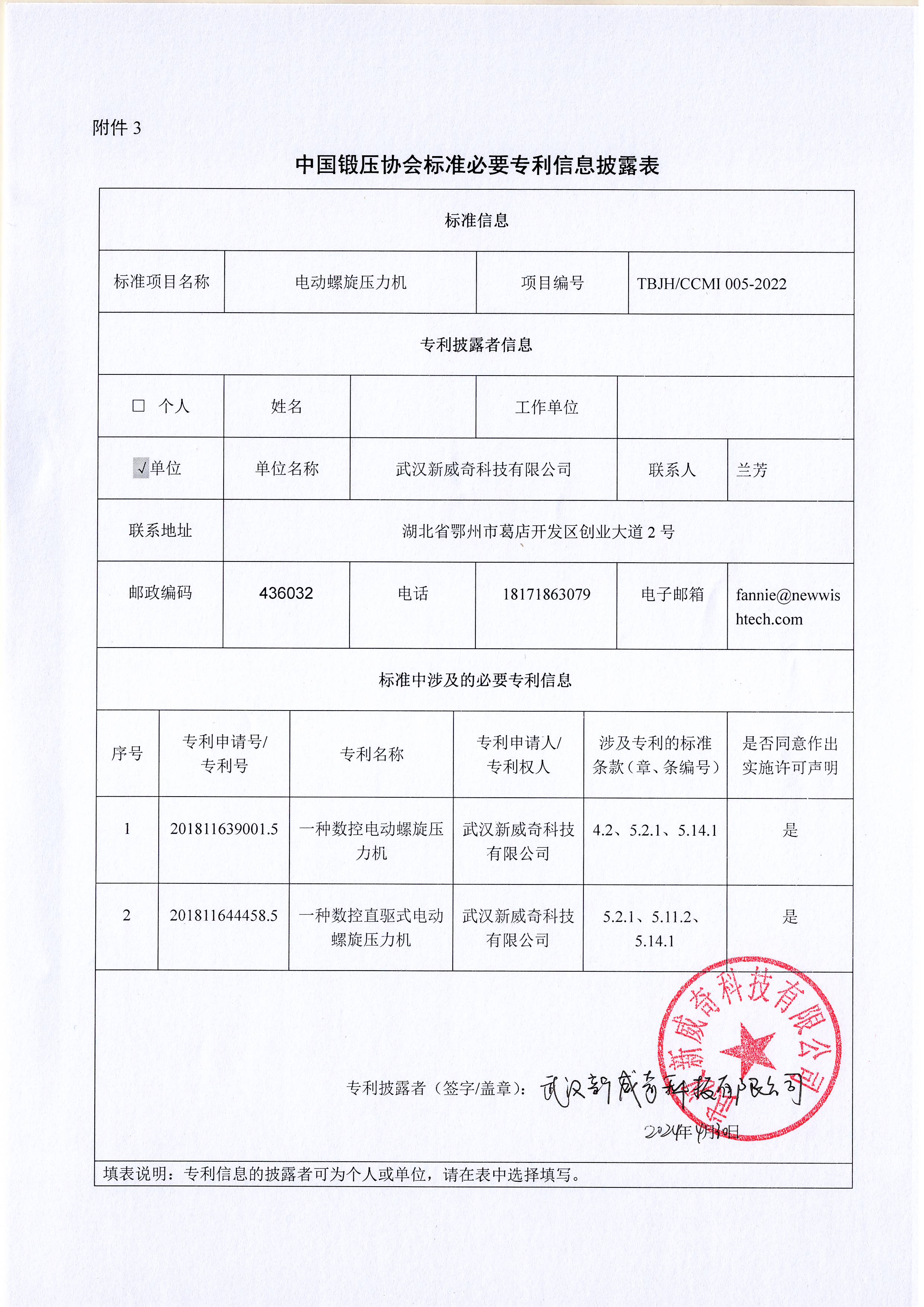 由中國鍛壓協會負責歸口管理的《電動螺旋壓力機》(項目編號:TBJH/CCMI 005-2022)團體標準報批稿已完成。按照《國家標準涉及專利的管理規定(暫行)》、《中國鍛壓協會標準管理辦法》及其配套標準的有關要求,現對報批稿中涉及的有關專利信息進行公示,請于2024年7月10日前將意見以郵件或電子郵件方式反饋至中鍛協標委會。