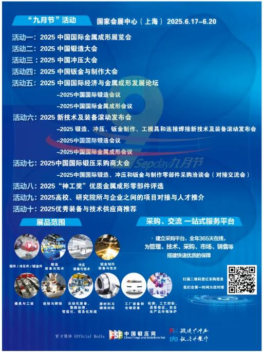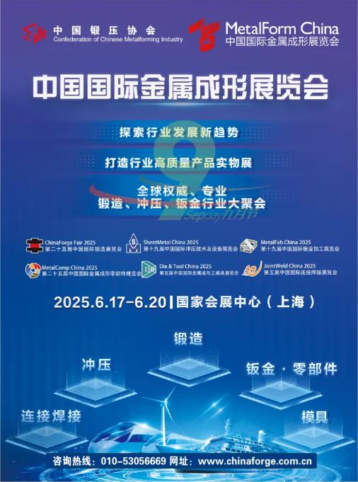 2025年中國國際金屬成形展覽會將于 2025 年6月17-20日繼續在國家會展中心(上海)舉辦,期待每一個行業同仁能夠積極參與,期待我們再次相聚!
