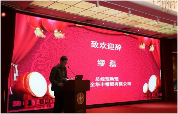 中國鍛壓協會理事單位、江陰全華豐精鍛有限公司總經理助理繆磊致歡迎辭,并做了題為《原材料智能倉儲與自動化下料技術的應用》的報告,闡述了下料自動化管理的重要性。