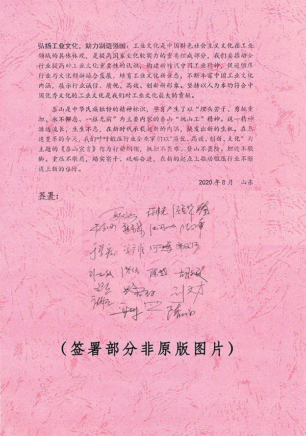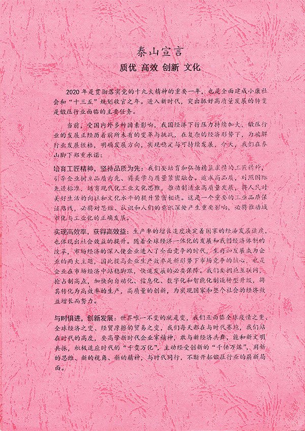 會上,以質優、高效、創新、文化為主題發布了《泰山宣言》,號召鍛壓行業要堅守工匠精神,堅持品質為先,對照國際先進標準,推動制造業高質量發展;要實現高效率,獲得高效益,擁抱互聯網,搶占制高點,加快向數字化、自動化和信息化造轉型升級,從而逐步實現智能化制;要與時俱進,創新發展,與新經濟共舞,和新文明共振;要弘揚工業文化,促進鍛壓行業與文化創新融合發展,培育工業文化新業態,助力制造強國建設。